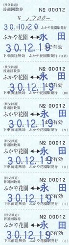 秩父鉄道のつづきます。 普通回数券は、1口座のみ設備されました。 ↑ ふかや花園⇔永田の普通回数券です。 地紋は、JPR地紋です。 発駅、発行駅、常備式です。 ↑ 裏面です。 次回につづきます。