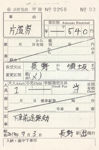 長野電鉄のつづきです。 長野駅出札窓口では、出札補充券も購入します。 ↑ 長野から須坂までの乗車券です。 出補での発行です。 地紋は、こくてつ地紋です。 発行駅、補充式です。 ↑ 裏面です。 「昭和」表記の古い券が残りますが、残念ながら西暦対応です。…